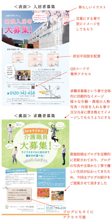 施設様独自の基本イメージを保ちながらもポスティングをする時期により、春には桜や緑のイラストや色を使い、